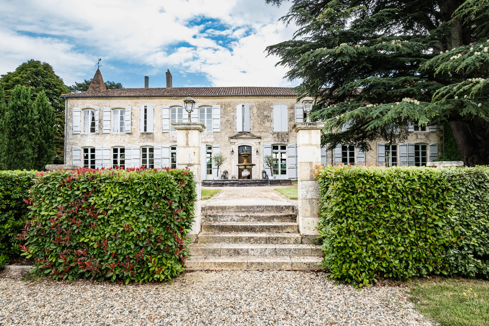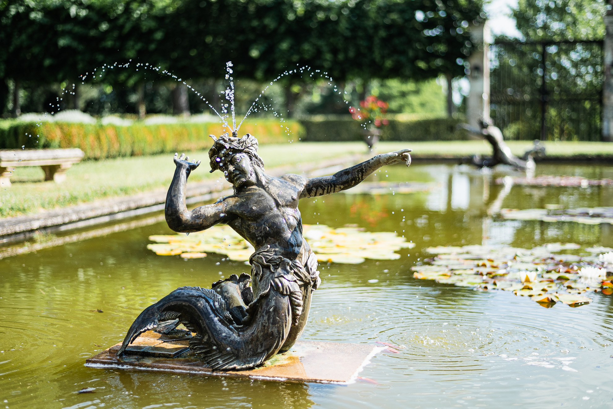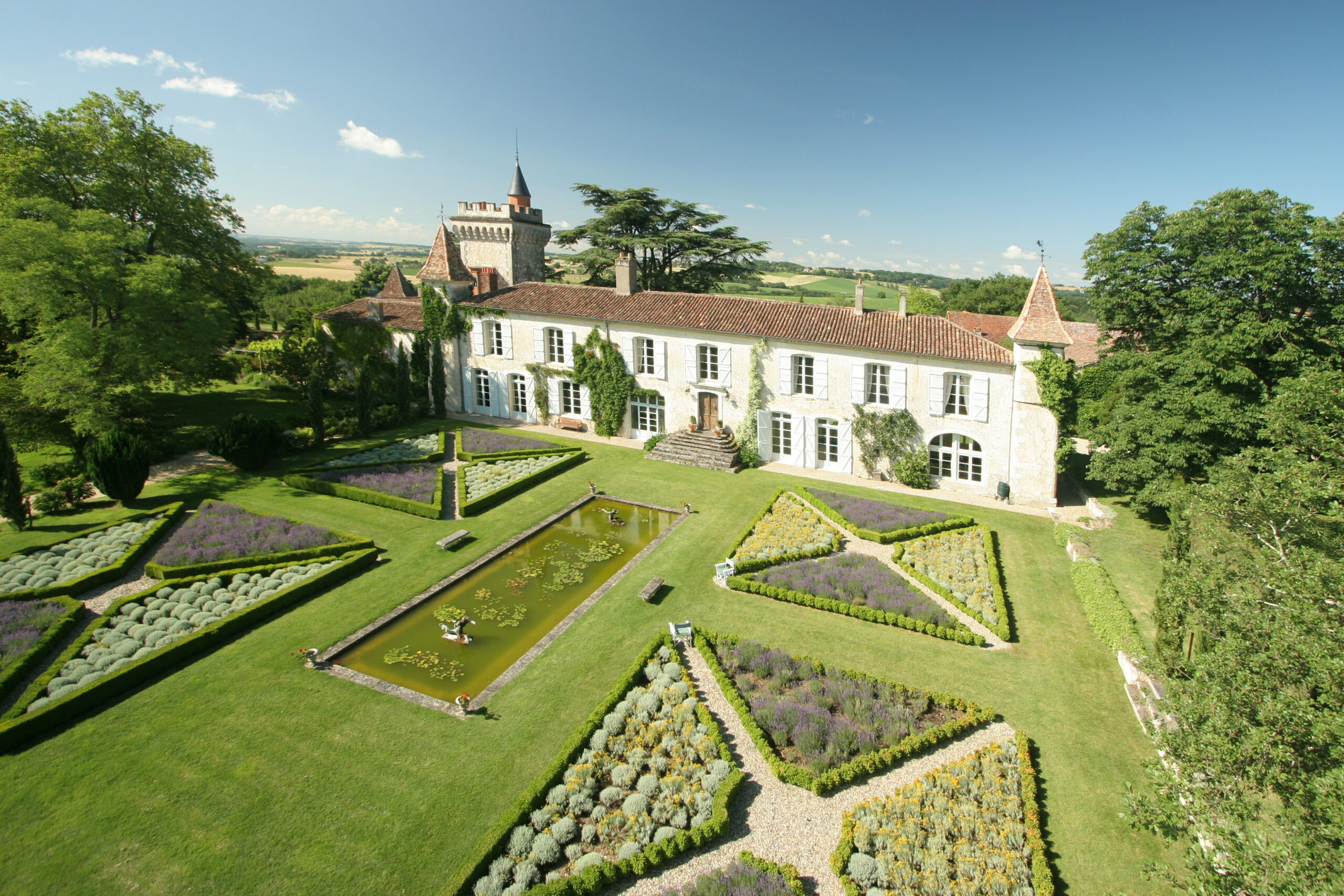 En se baladant autour du Château, les paysages et décors changent. Alors que la façade principale accueille avec prestance et minimalisme les visiteurs autour de sa fontaine ronde centrale et de ses pins majestueux plantés au pied de l’imposante tour carré; côté Sud, le délicat jardin à la française, avec son air de « Petit Versailles », est, quant à lui, plutôt une invitation à la contemplation. Tout en finesse et en poésie. Comme un appel à la lecture, à la peinture. Ou à la tenue de cocktails royaux au pied de son large bassin planté de nénuphars…