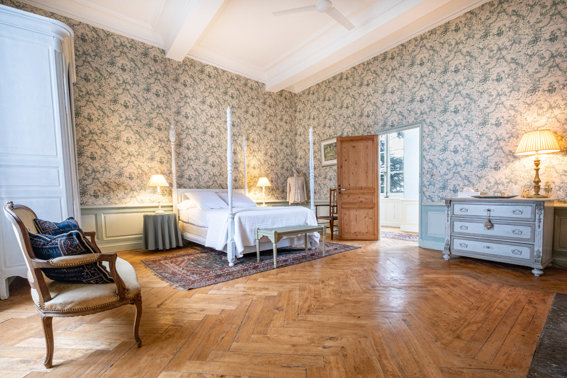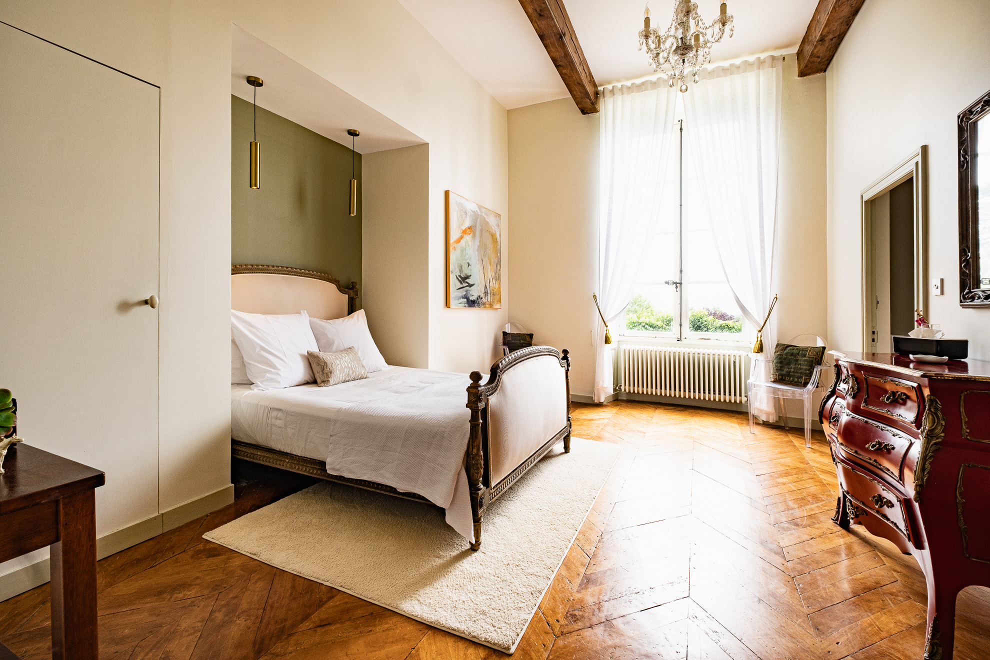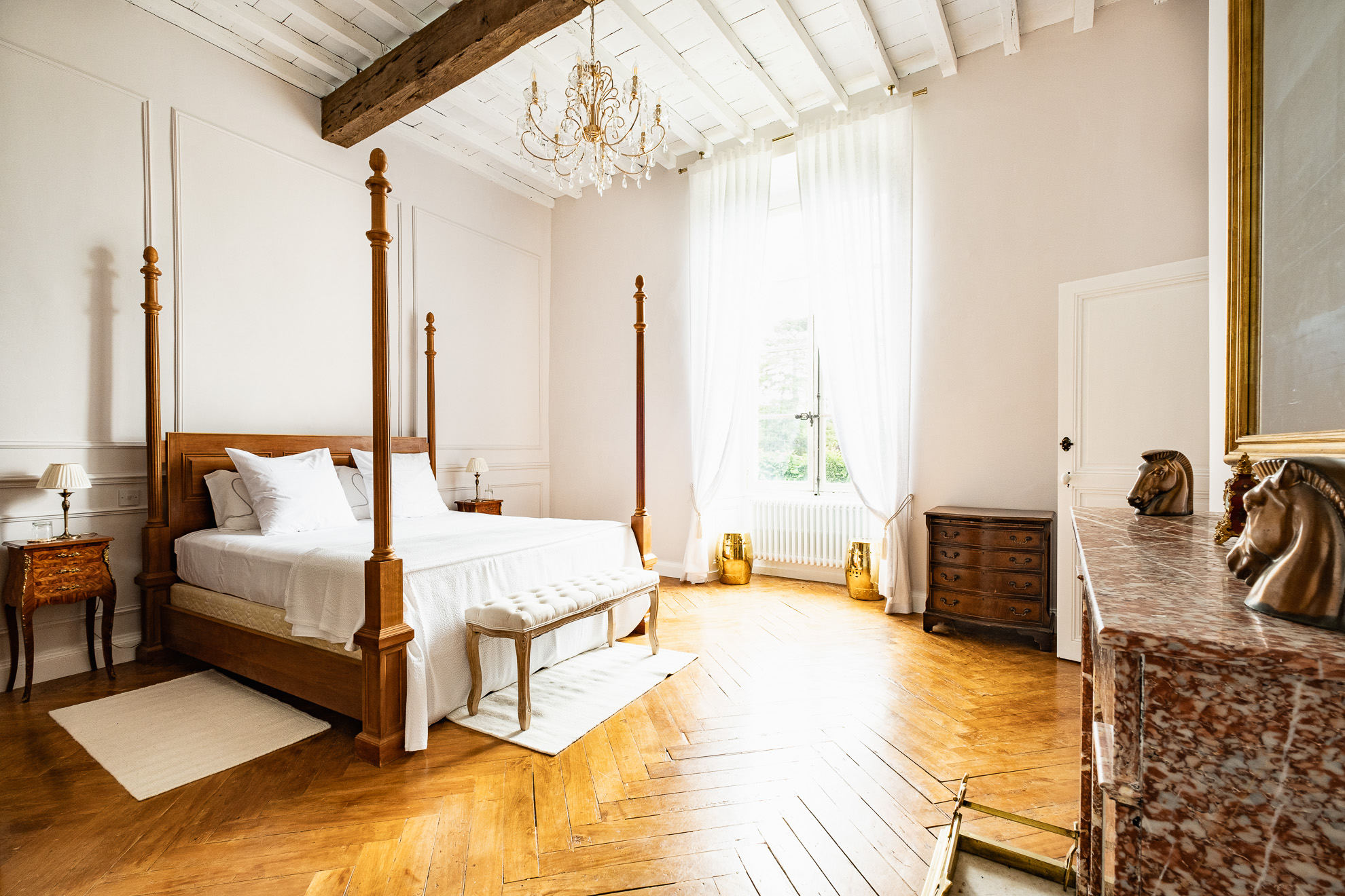 En se baladant autour du Château, les paysages et décors changent. Alors que la façade principale accueille avec prestance et minimalisme les visiteurs autour de sa fontaine ronde centrale et de ses pins majestueux plantés au pied de l’imposante tour carré; côté Sud, le délicat jardin à la française, avec son air de « Petit Versailles », est, quant à lui, plutôt une invitation à la contemplation. Tout en finesse et en poésie. Comme un appel à la lecture, à la peinture. Ou à la tenue de cocktails royaux au pied de son large bassin planté de nénuphars…