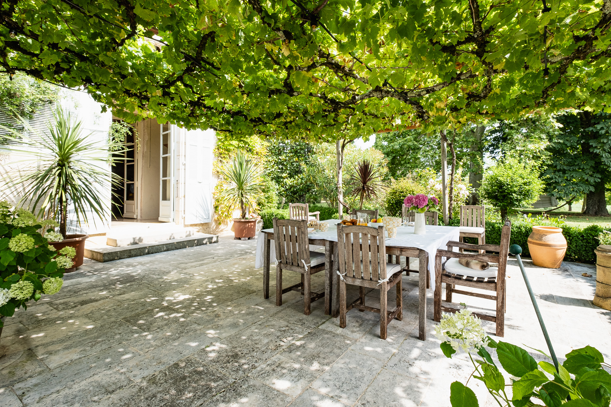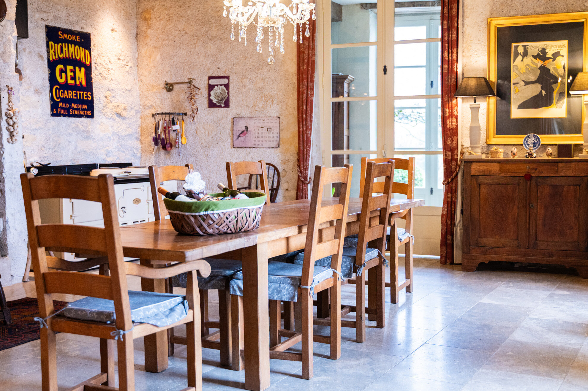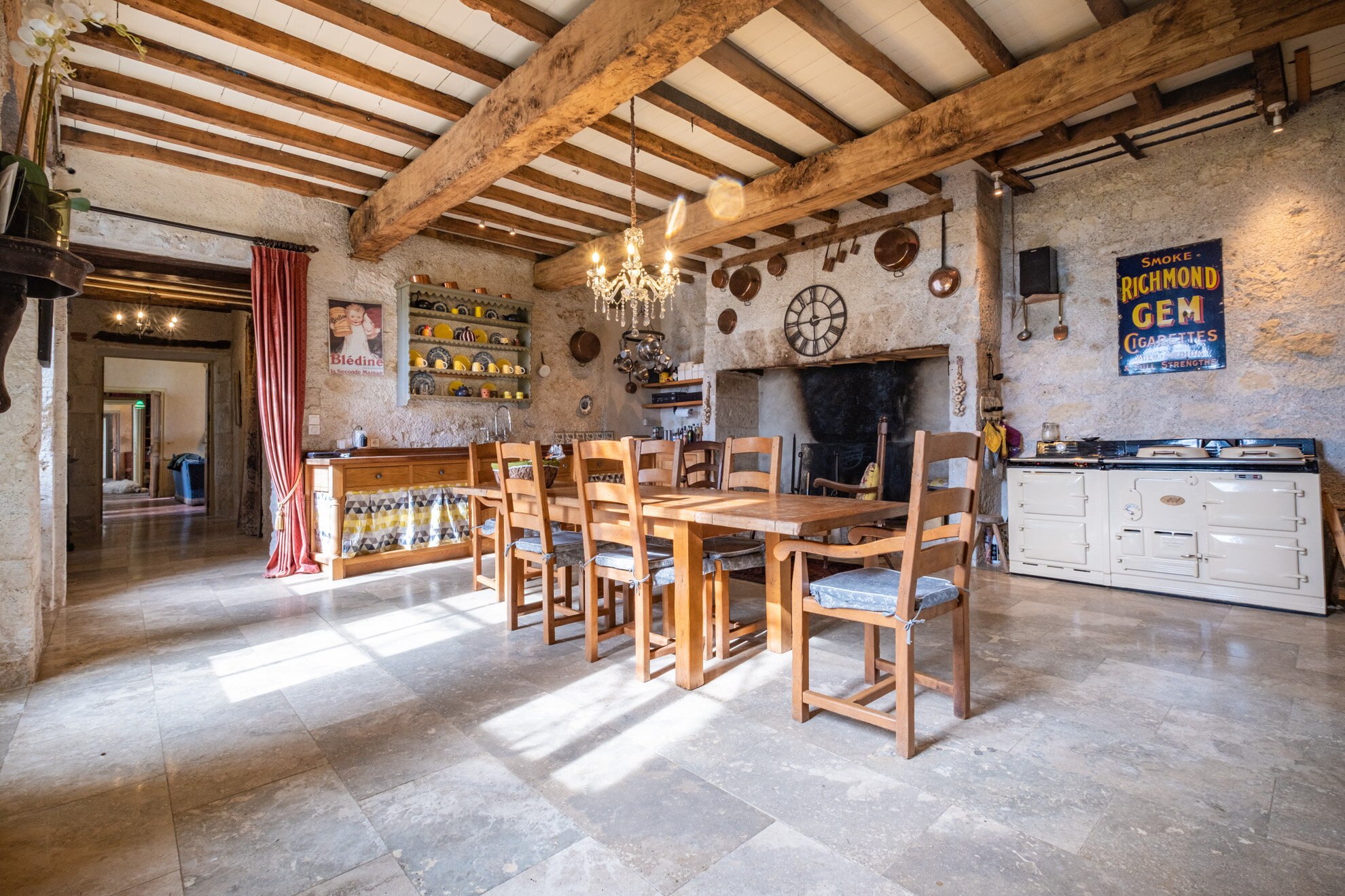 La cuisine n’est pas en reste en matière de confort et de convivialité. Elle est composée de 3 espaces : la cuisine centrale de 40m2 avec cheminée, une grande table pour 12 personnes et d’un poële de cuisine anglais ©AGA, avec lequel les non-anglosaxons devront faire connaissance. Il y a également un garde manger, et une arrière cuisine complète très bien équipée de 16m2. La cuisine est ouverte sur la terrasse ombragée de vignes disposant d’un espace de repas pour 12 personnes et d’une plancha gaz XL professionnelle. Lorsque le soleil se fait vraiment trop fort, ou qu’une petite pluie s’invite pendant un séjour, il est toutefois toujours possible de profiter de la beauté du paysage sous la terrasse couverte, offrant également un autre espace repas de 12/14 personnes, mais surtout une cheminée couverte où les grillades et braseros nocturnes sont vivement recommandés.