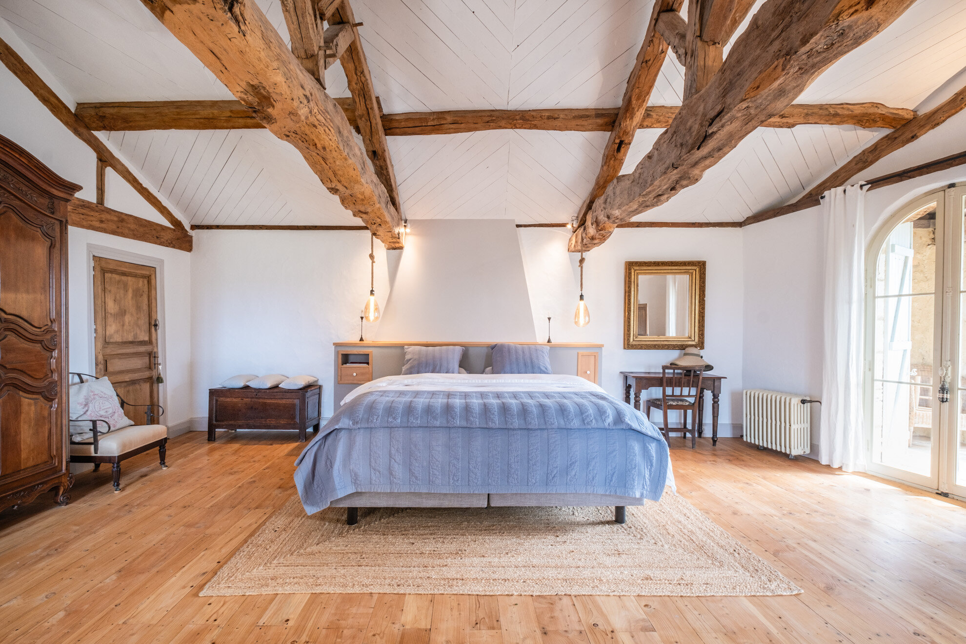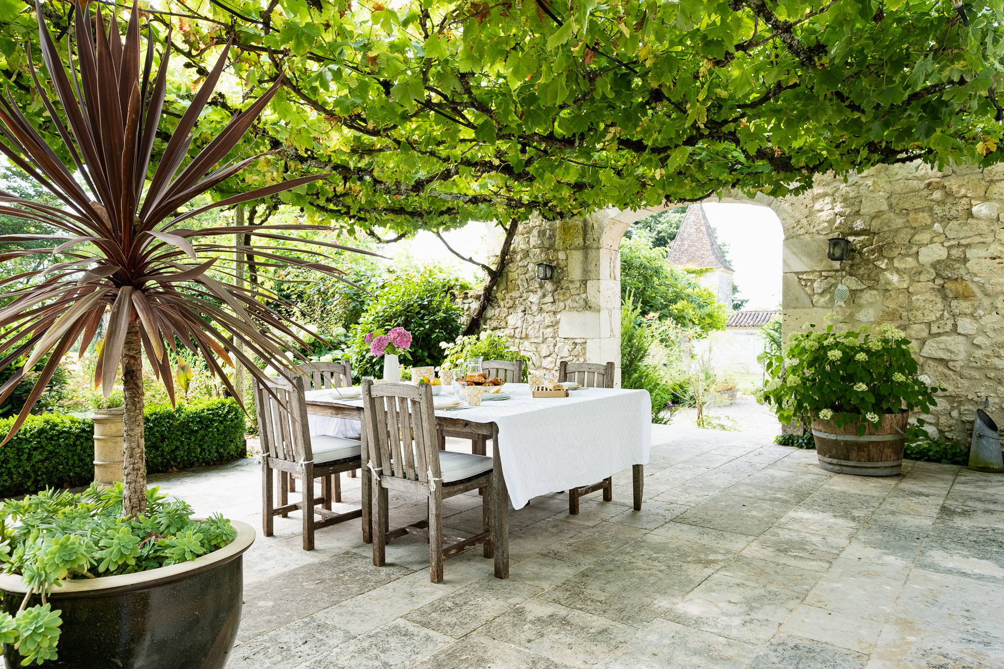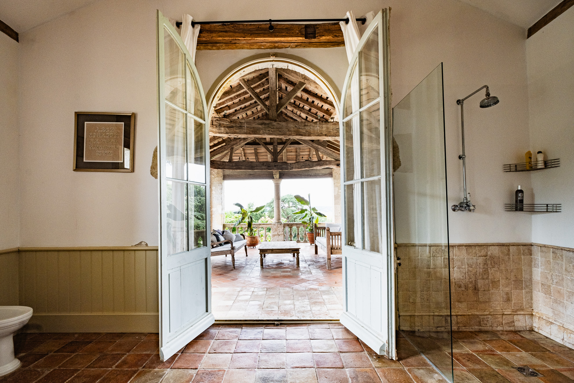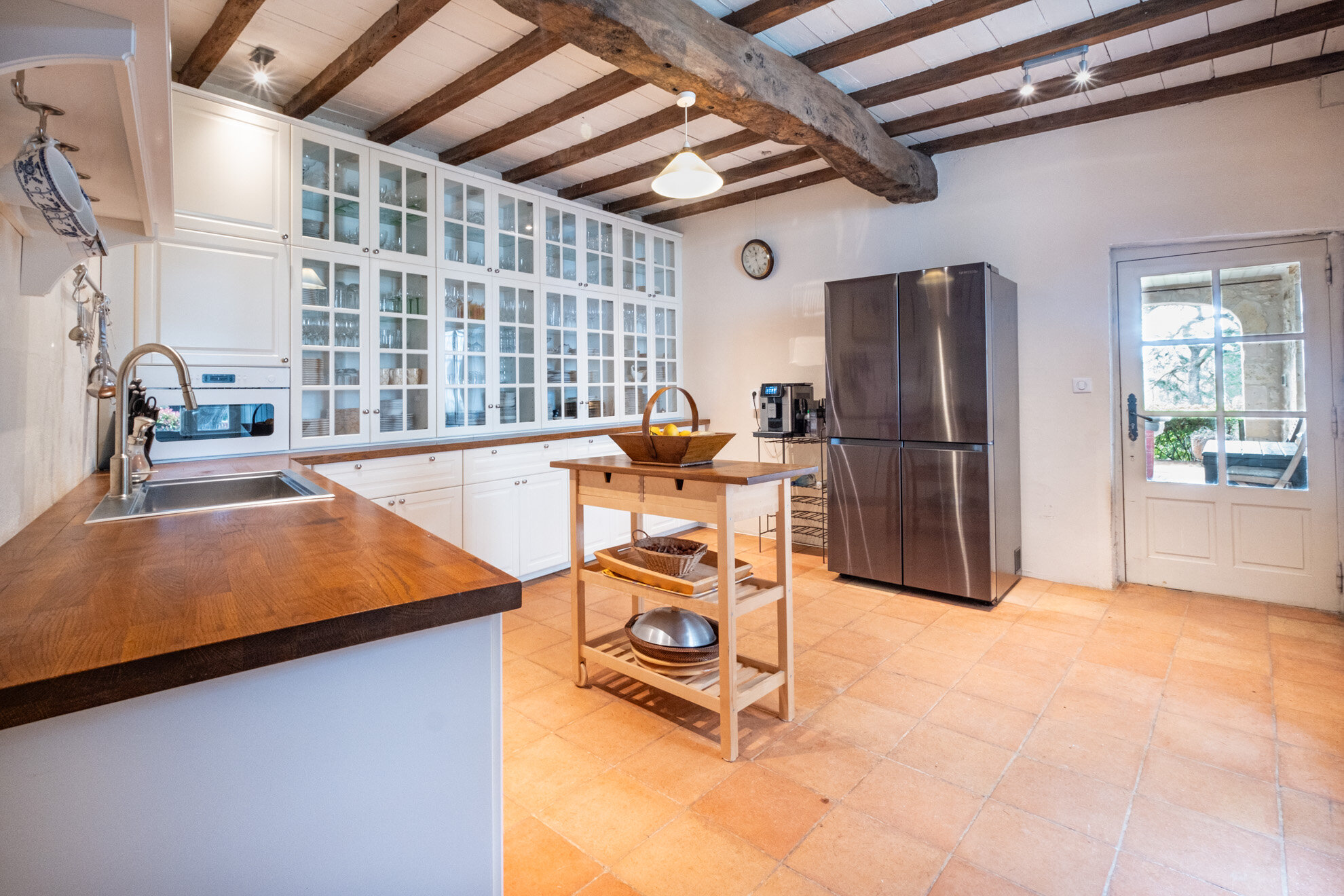 La cuisine n’est pas en reste en matière de confort et de convivialité. Elle est composée de 3 espaces : la cuisine centrale de 40m2 avec cheminée, une grande table pour 12 personnes et d’un poële de cuisine anglais ©AGA, avec lequel les non-anglosaxons devront faire connaissance. Il y a également un garde manger, et une arrière cuisine complète très bien équipée de 16m2. La cuisine est ouverte sur la terrasse ombragée de vignes disposant d’un espace de repas pour 12 personnes et d’une plancha gaz XL professionnelle. Lorsque le soleil se fait vraiment trop fort, ou qu’une petite pluie s’invite pendant un séjour, il est toutefois toujours possible de profiter de la beauté du paysage sous la terrasse couverte, offrant également un autre espace repas de 12/14 personnes, mais surtout une cheminée couverte où les grillades et braseros nocturnes sont vivement recommandés.