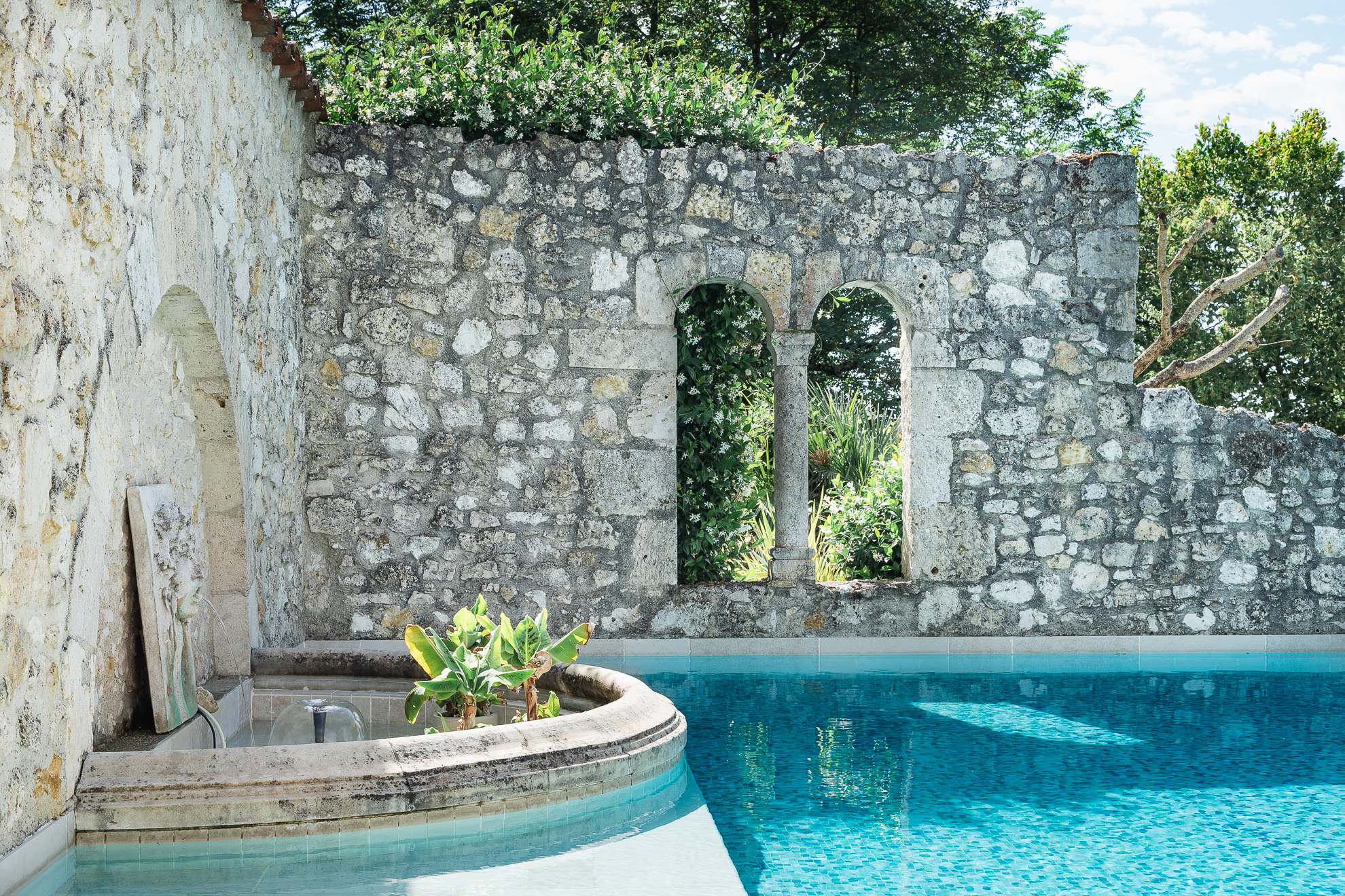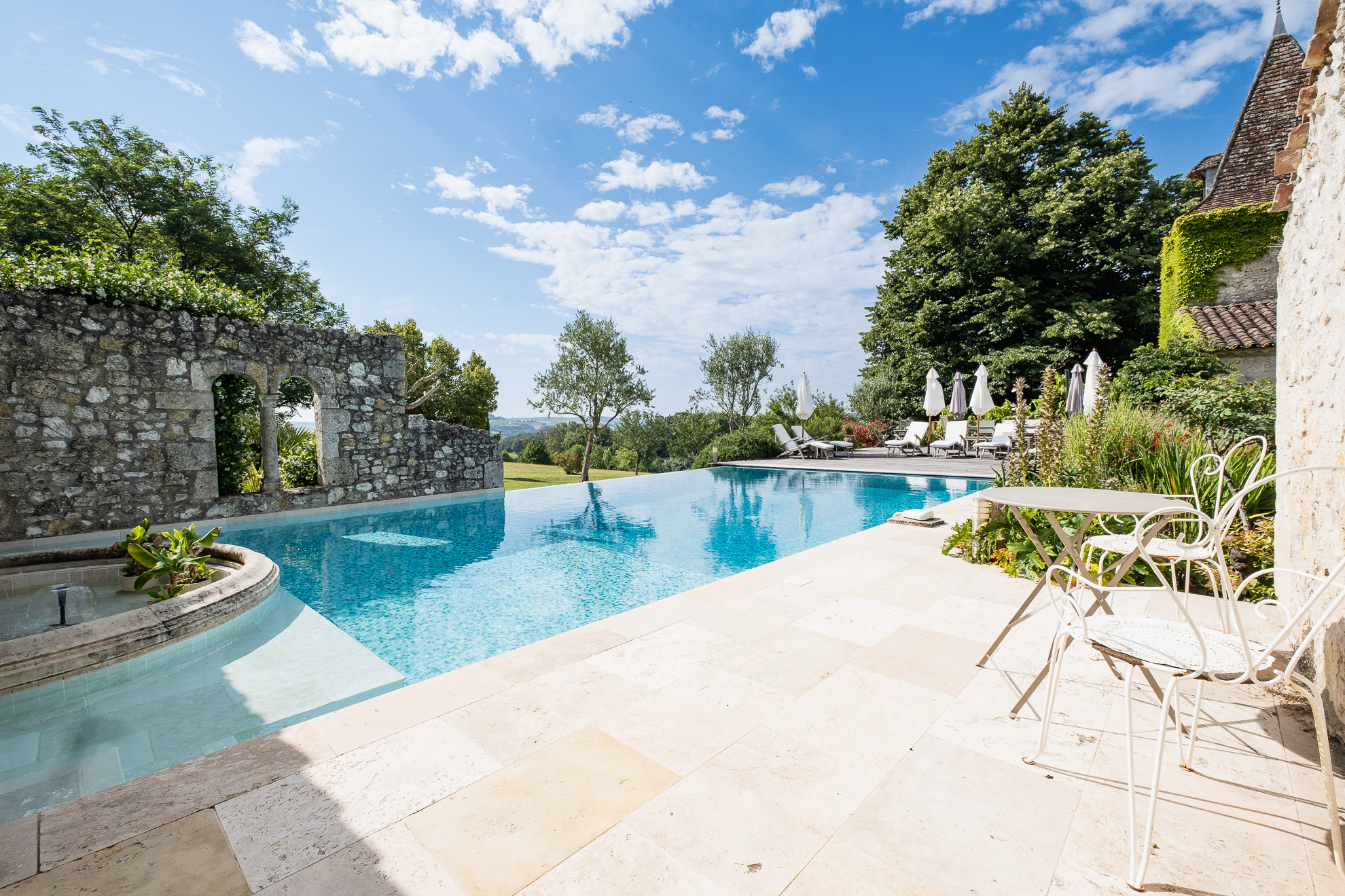 De l’espace piscine, émane encore une autre atmosphère. Comme un air de Toscane, avec son eau azure nichée au coeur de romantiques ruines préservées. Chauffée, cette piscine a débordement possède une jolie fontaine intérieure, une place immergée et une terrasse avec chaises longues et parasols. Non loin, de cet espace, les voyageurs pourront profiter du terrain de pétanque, de la table de ping-pong, ou encore du hamac à l’ombre du parc.